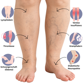 Viele Menschen leiden unter Beschwerden wie Lymphödemen, Thrombose, Krampfadern oder venöser Insuffizienz – oft unbemerkt und unterschätzt. Auch Schwangerschaft oder Diabetes können zu schmerzhaften Schwellungen und Durchblutungsstörungen führen. Dieses Bild zeigt die häufigsten Ursachen für müde, geschwollene oder schmerzende Beine – und verdeutlicht, warum gezielte Unterstützung durch Kompressionsstrümpfe so wichtig ist.