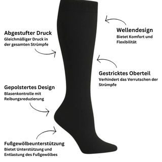 Hilft, Schwellungen in Knöcheln und Waden vorzubeugen. Perfekt für lange Tage, Reisen oder Arbeiten im Stehen.